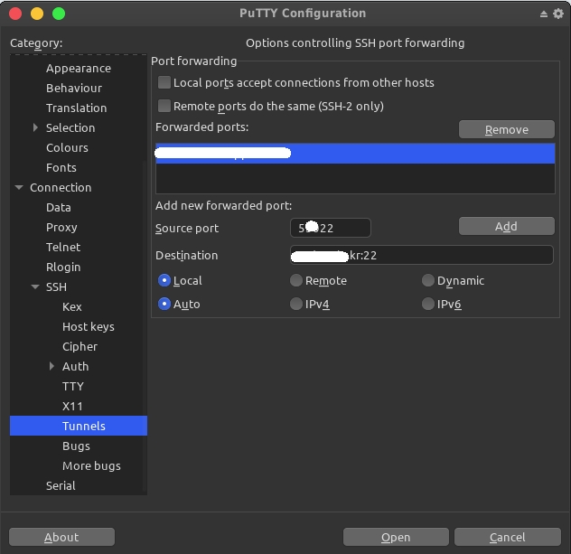 Local 에서 Tunnel 을 사용할 별도의 Port (5xy22) 를 Source port 에 기록